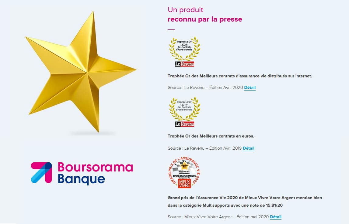 Mais les recettes de ce succès fonctionnent-elles aussi dans lassurance vie. Lassurance vie à la. Les produits assurance vie Boursorama ont été largement reconnus et récompensés comme par exemple par le Label dexcellence des Dossiers de LEpargne édition 2012 le Trophée Or sur la catégorie Contrat vie en euros du magazine Le revenu en 2012 et le Trophée Attrayant sur la catégorie Contrat vie Multi supports offensifs du magazine Le revenu en 2012.