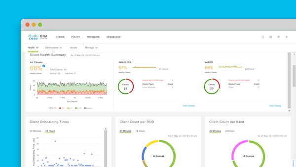 It offers an intent-based platform for IT and business applications that streamlines network operations and assures required reliability and performance levels. Cisco DNA Center with Assurance Mentored Implementation. The Cisco DNA Center Assurance Wi-Fi 6 Dashboard provides a visual representation of your wireless network.